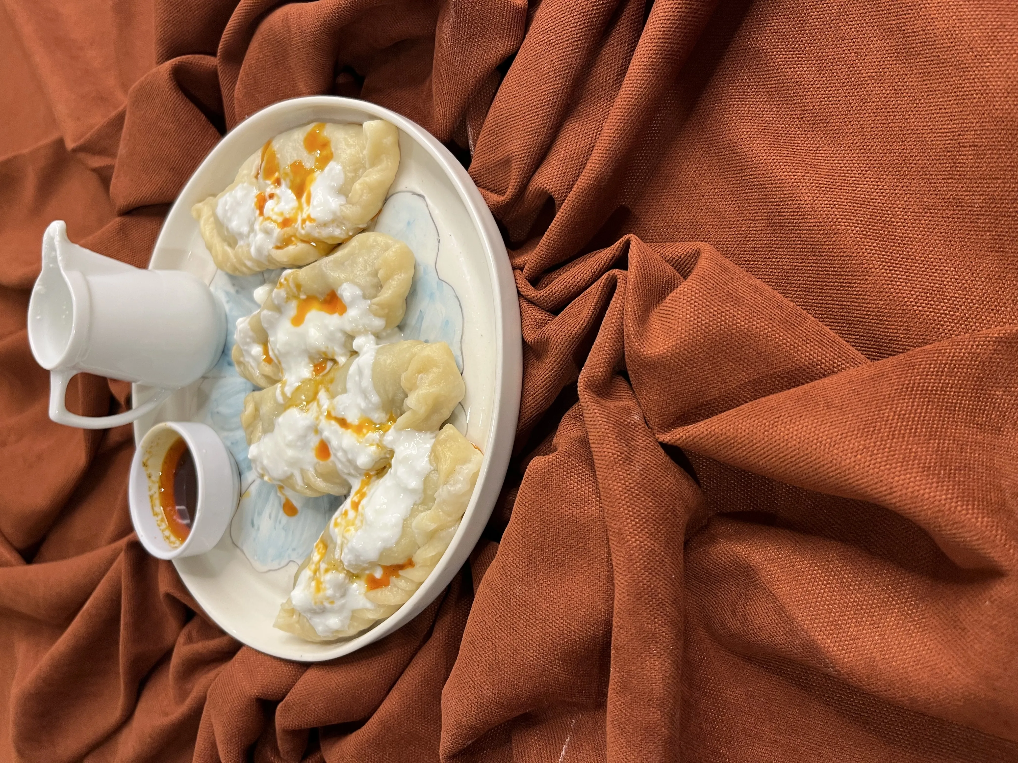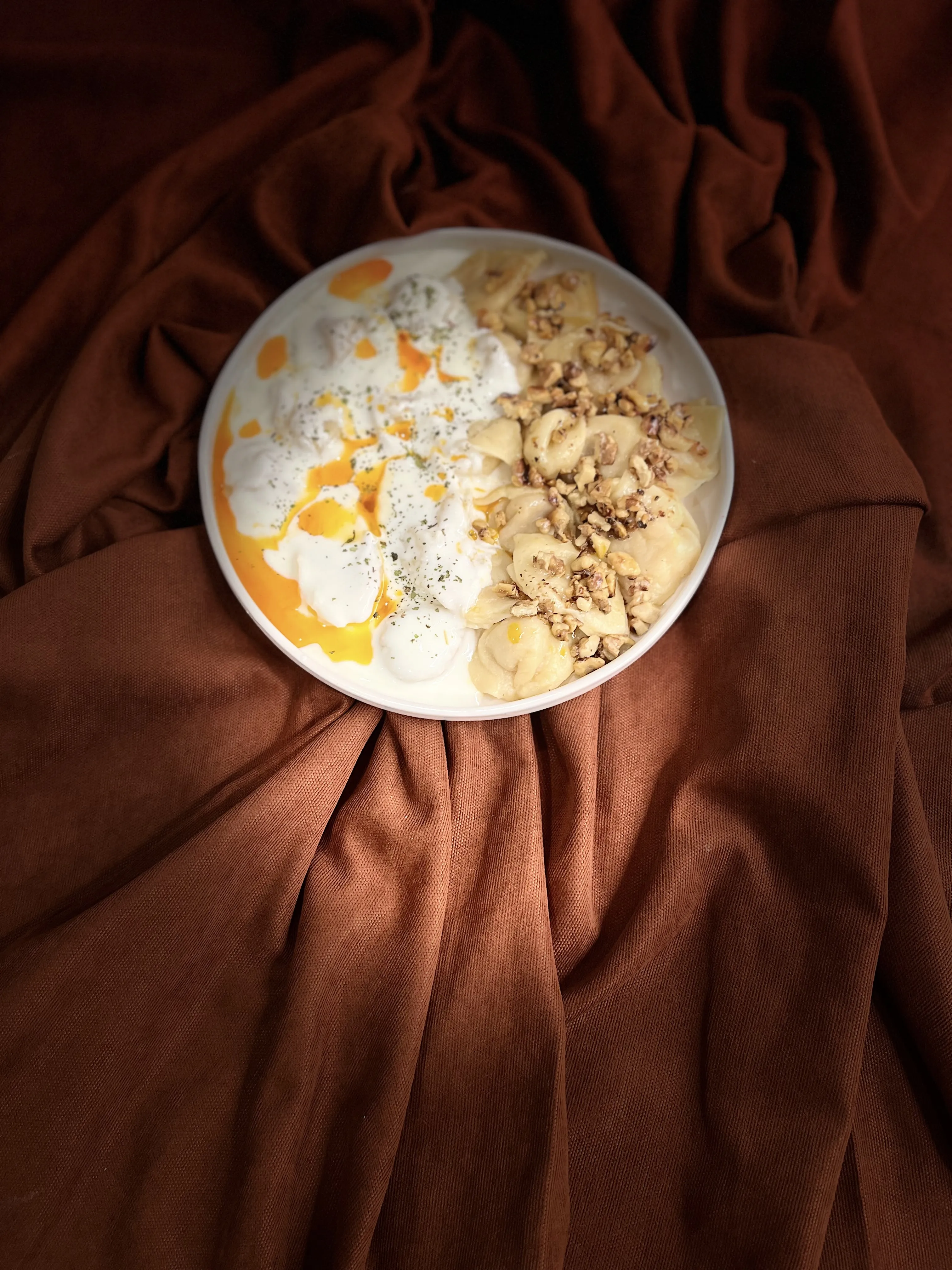 Yarısı yoğurtla süslenmiş yarısı cevizli olan el açması Sinop mantısı